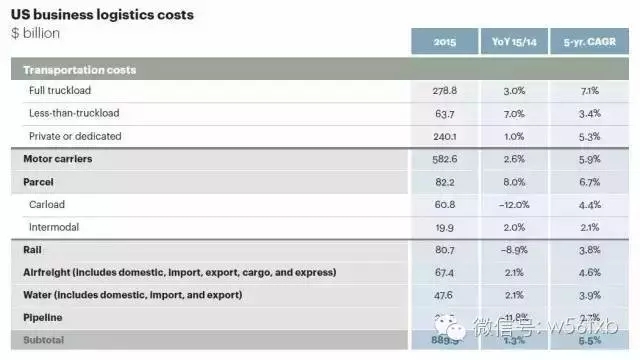 受電子商務(wù)交易量的迅速增長的影響,2015年美國零擔(dān)和快遞包裹運(yùn)輸分別增長了7%和8%,而依賴能源和大宗物資的生產(chǎn)物流的鐵路和管道運(yùn)輸則大幅度下降。