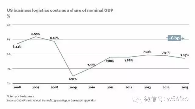 物流成本占GDP的比例是重要的指標(biāo),也稱為經(jīng)濟(jì)的物流指數(shù)。2015年,美國維持商業(yè)物流系統(tǒng)的總成本為1.4萬億美元,這相當(dāng)于美國GDP(大于17萬億美元)的7.85%。作為歷次物流年報(bào)的重要指標(biāo),2015年美國物流成本占GDP的比重僅比上一年的數(shù)低了6個(gè)基點(diǎn),這表示整個(gè)美國商業(yè)物流系統(tǒng)的運(yùn)行效率僅僅比上一年好一點(diǎn)點(diǎn)。