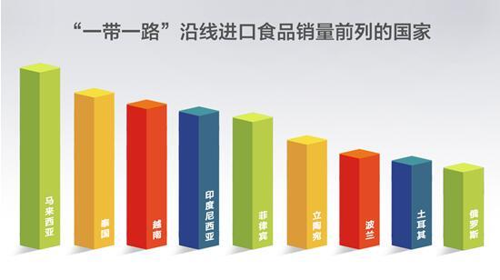 馬來(lái)西亞、泰國(guó)、越南、印度尼西亞、菲律賓、立陶宛、波蘭、土耳其、俄羅斯等“一帶一路”沿線國(guó)家的進(jìn)口食品銷量位于前列。