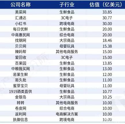 從電子商務(wù)的細(xì)分行業(yè)來看,2018年生鮮食品的估值和獨(dú)角獸數(shù)量最高,合計(jì)估值為114.47億美元,有7家企業(yè)。3C電子有2家企業(yè),合計(jì)估值位居第二,為45.77億美元??缇畴娚绦袠I(yè)估值位居第三,估值為40.00億美元,有2家企業(yè)。綜合電商、大宗商品、母嬰玩具、其他電商服務(wù)、電商解決方案行業(yè)獨(dú)角獸企業(yè)估值均在30億美元及以下,且獨(dú)角獸企業(yè)數(shù)量均低于3家。