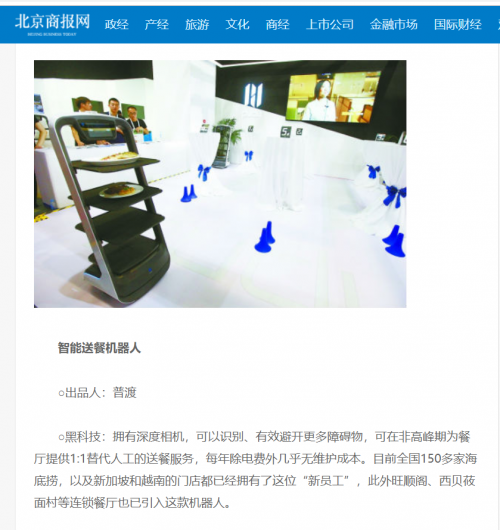 北京商報對“歡樂送”進(jìn)行了詳細(xì)地介紹。據(jù)介紹,普渡科技“歡樂送”送餐機(jī)器人擁有深度相機(jī),可以識別、有效避開更多障礙物,可在非高峰期為餐廳提供1:1替代人工的送餐服務(wù),每年除電費外幾乎無維護(hù)成本。目前全國150多家海底撈,以及新加坡和越南的門店都已經(jīng)擁有了這位“新員工”,此外旺順閣、西貝莜面村等連鎖餐廳也已引入這款機(jī)器人。
