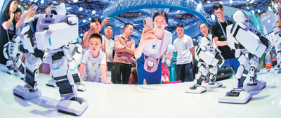 在智博會(huì)一個(gè)展臺(tái),機(jī)器人翩翩起舞吸引大批參觀者。