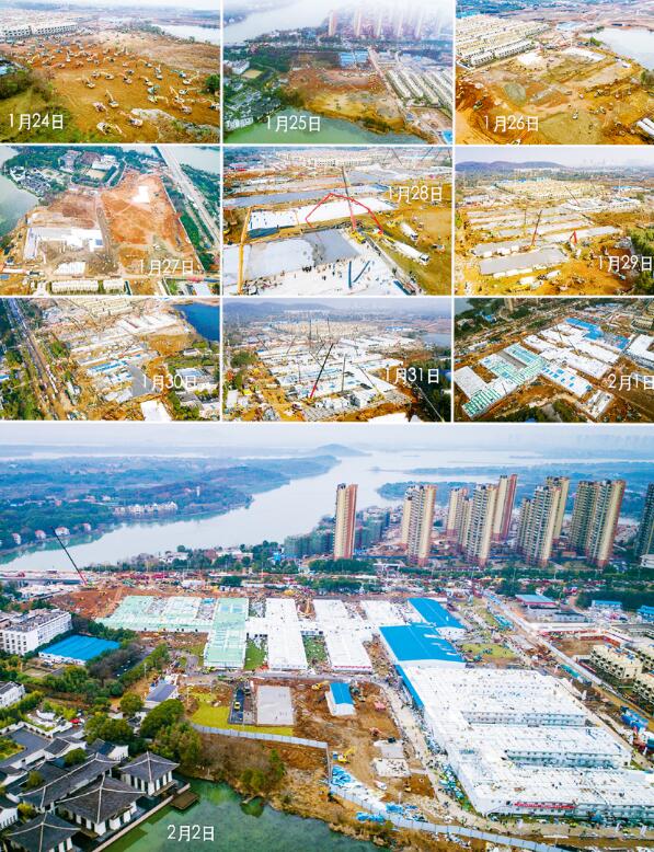 總建筑面積超過3萬平方米,架設(shè)箱式板房近2000間,接診區(qū)病房樓ICU俱全……火神山醫(yī)院從開始設(shè)計(jì)到建成完工,歷時(shí)10天。圖為標(biāo)注日期的拼版照片(無人機(jī)拍攝)。 新華社記者 肖藝九/攝