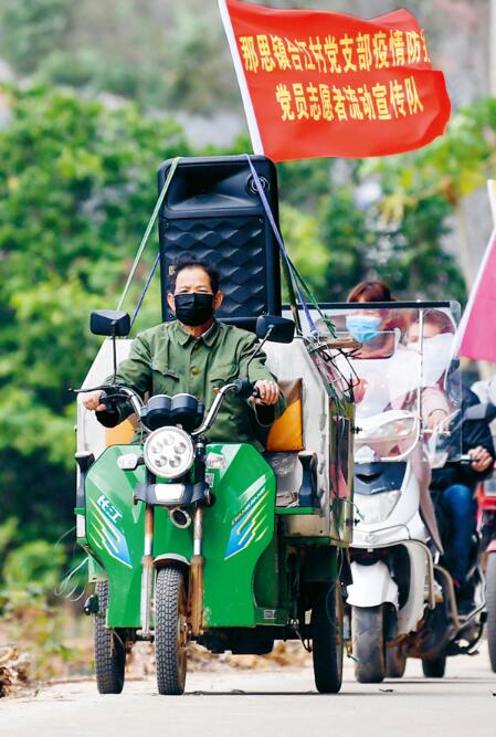 連日來,廣西欽州市構(gòu)建縣、鄉(xiāng)、村三級(jí)聯(lián)防聯(lián)控機(jī)制,近萬名黨員干部和志愿者奔赴一線,投入到新冠肺炎疫情防控工作中。圖為2月1日欽州市欽南區(qū)那思鎮(zhèn)合江村黨員吳光圍(前)帶領(lǐng)宣傳隊(duì)進(jìn)村宣傳防疫知識(shí)。 新華社記者 張愛林/攝
