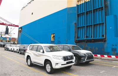 在海南自貿(mào)試驗(yàn)區(qū)??诟?,來(lái)自卡塔爾的平行進(jìn)口車(chē)??吭跐L裝貨船旁。 新華社記者 楊冠宇攝
