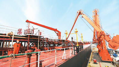 在浙江自貿(mào)試驗(yàn)區(qū),“浙海油6”號(hào)輪裝載的4500噸低硫燃料油日前通過(guò)輸油管道進(jìn)入中化興中石油轉(zhuǎn)運(yùn)(舟山)公司出口監(jiān)管倉(cāng)庫(kù)。 姚 峰攝(人民圖片)