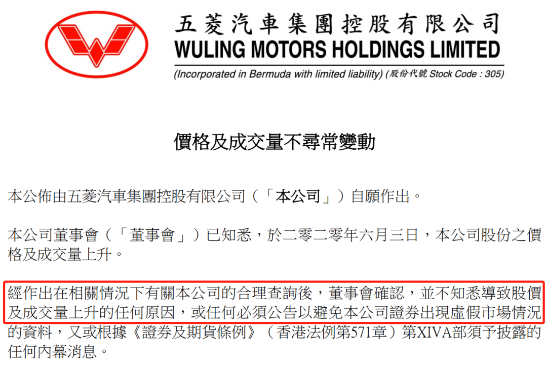 對此,五菱汽車于盤后發(fā)布公告稱,董事會確認,并不知悉導致股價及成交量上升的任何原因,或任何必須公告以避免本公司證券出現(xiàn)虛假市場情況的資料。