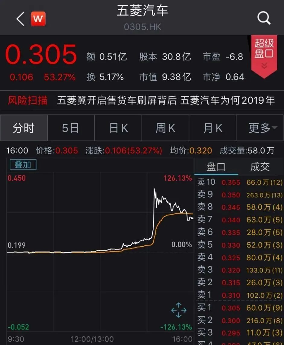 6月3日,五菱榮光的一篇文章更是刷爆全網(wǎng),人民需要什么,五菱就造什么,光速推出“擺攤神車”,在號稱是地攤兒正規(guī)軍的消息助推下,港股五菱汽車股價一度暴漲超120%。雖然收盤價有所回落,但五菱汽車漲幅依然高達53%,報0.305港元/股。
