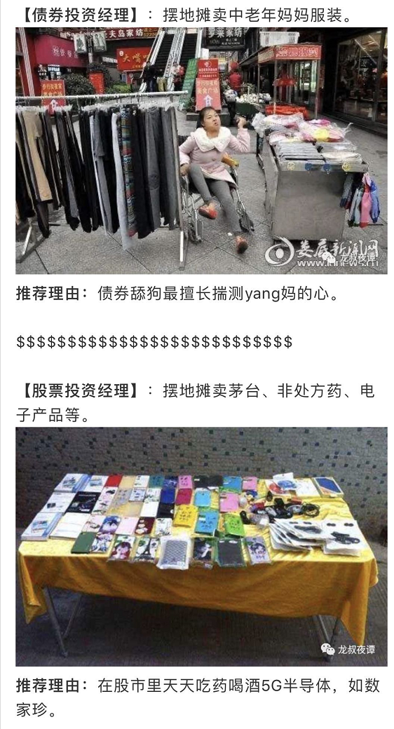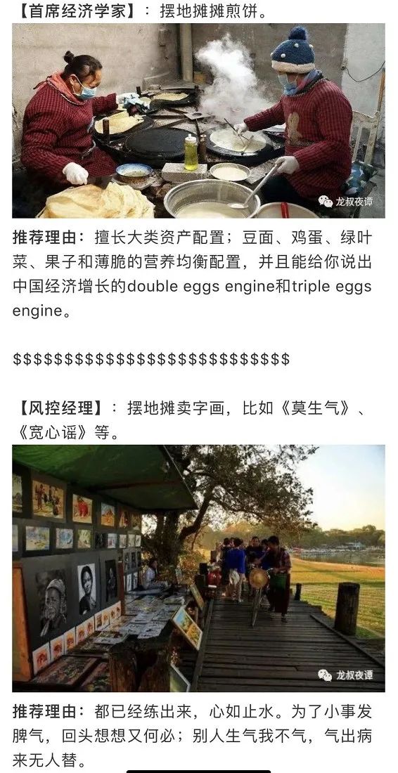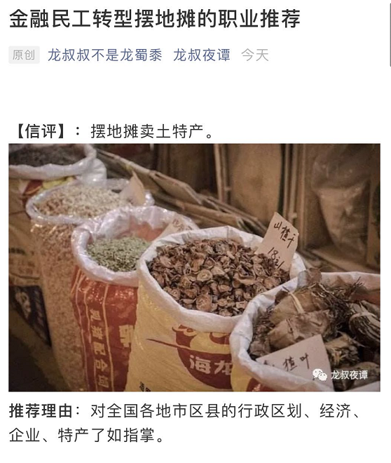 微信公眾號“龍叔夜譚”還給出了金融民工轉型擺地攤該做什么好。