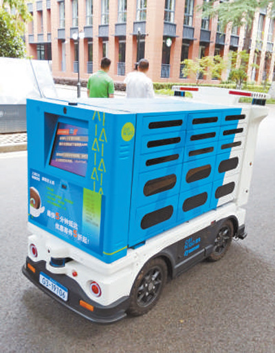 上海交大校園里的菜鳥驛站無人駕駛快遞車。