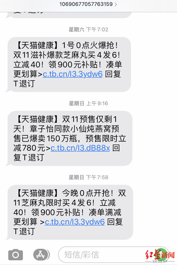 這天晚上,“雙十一”促銷活動正式開啟。周燮在頭部主播薇婭和李佳琪的直播間來回跳轉(zhuǎn)購買,與直播間瘋狂上漲的成交額一起,各大電商平臺的營銷短信也蜂擁而入。與周燮有同樣煩惱的人不在少數(shù)。“(垃圾短信)太多了,我也懶得清理?!焙陀浾吡奶鞎r,余翡打開手機短信箱,顯示的未讀信息有2000余條。她一條條劃過,除重要信息外,9成以上都是電商平臺的營銷短信。除“雙十一”促銷活動,其他電商促銷活動期間的營銷短信也有不少。瘋狂轟炸的營銷短信給她帶來不少困擾。比如,做銷售的她經(jīng)常會因此遺漏掉客戶的重要信息。她也曾為此向平臺進行過投訴,“平臺回復大都敷衍。如果要徹底解決,只能挨個兒一家家自己去找店家溝通?!钡碳姨?,后來她也就此作罷。周燮也曾試著和店家挨個兒發(fā)信息溝通,有些商家將其解釋為是在為她提供信息和優(yōu)惠,并不認為這是“垃圾短信”。也有商家告訴她可以選擇“回復T退訂”或手機設置垃圾短信攔截功能,但她依然收到了營銷短信。不止是營銷短信,前兩天,成都人謝澍還接過一個來自杭州的座機電話。接通后,電話那頭傳來一個男聲,通知他某某電商店鋪有活動,邀請他參與。那時他正在參加一個學術會議,聽到后沒好氣地回了句“不需要”就掐斷了電話。對于此類營銷信息,記者對話的5位受訪者,不約而同將其界定為“垃圾短信”。平臺: