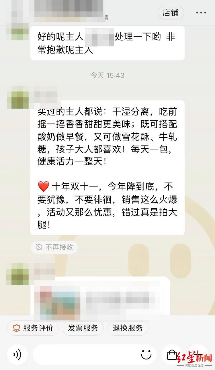 無一家給出最終解決方案針對“雙十一”促銷活動營銷短信大潮問題,記者以消費者身份先后咨詢了阿里巴巴、京東、拼多多、美團電商平臺客服。四家平臺客服的回復均大同小異:平臺無法阻止平臺商家給消費者發(fā)送營銷短信,建議消費者與商家溝通。當記者提及,近日工業(yè)和信息化部信息通信管理局明令禁止電商平臺未經(jīng)消費者允許不得擅自發(fā)送營銷短信,平臺有無措施干預時,有人表示暫無相關措施,有人表示后續(xù)將有專人聯(lián)絡解答?!跋M者可以選擇回復‘T’退訂或設置垃圾短信攔截功能?!卑⒗锇桶涂头缡腔貜秃螅浾咦穯枺骸盎貜土送擞?,也設置了垃圾短信攔截功能,但依然收到了營銷短信,怎么辦?”對方表示消費者可以和平臺商家進行溝通。記者從拼多多平臺客服回復里了解到,目前拼多多只支持關閉App營銷或物流通知的推送短信,消費者如若收到商家騷擾,可以打開與商家聊天頁面進行投訴。京東客服則表示,如果消費者不希望收到由京東平臺發(fā)送的平臺信息,可以撥打客服人工熱線要求其設置攔截。至于商家,對方表示平臺沒辦法幫助消費者阻止店鋪發(fā)送營銷短信的行為,消費者可以設置騷擾攔截,或與商家溝通。美團外賣客服與京東客服回復類似:“平臺無法幫消費者取消商家的營銷短信,但會加強監(jiān)管,后續(xù)也將建議后臺在平臺增設消費者不接受店鋪營銷短信的功能選項?!彪S后,記者打開阿里巴巴、京東等電商平臺與商家進行溝通,表示不希望再收到營銷短信。幾家平臺的商家回復均類似:消費者可以“回T退訂”,如若不成功,可留下號碼,客服將反饋給店鋪運營。當記者詢問后續(xù)是否還會收到營銷短信時,并無商家正面作答。值得一提的是,盡管記者提出不愿再收到營銷短信,對話結束后,有幾家店鋪的對話框里仍然彈出了商品促銷活動。