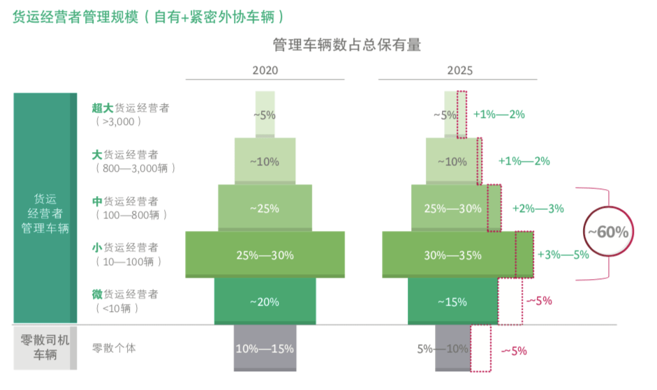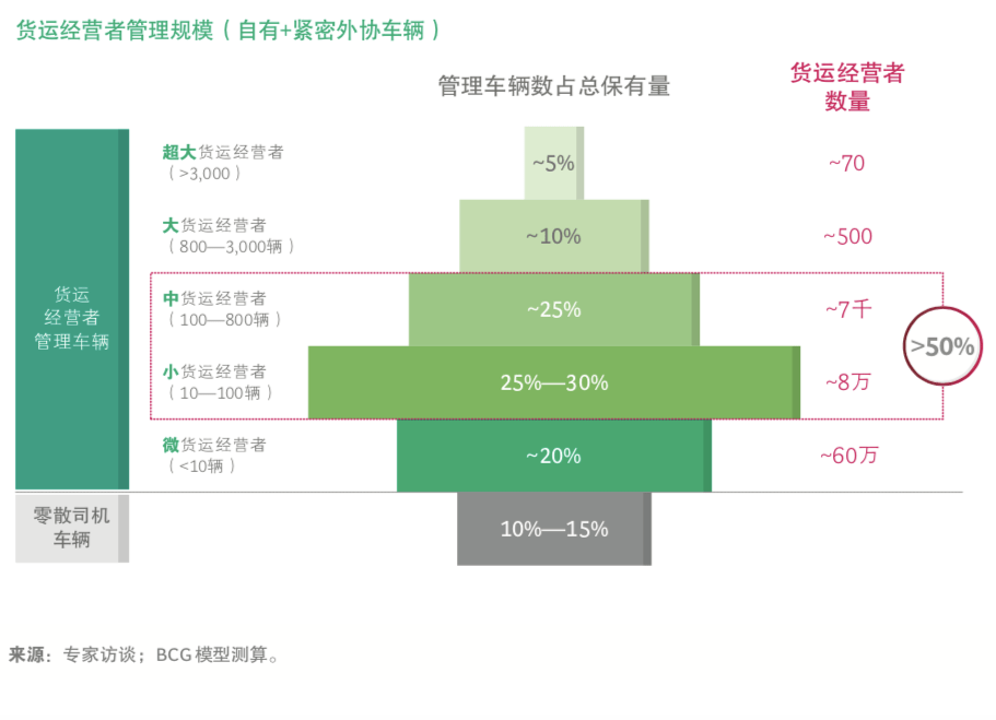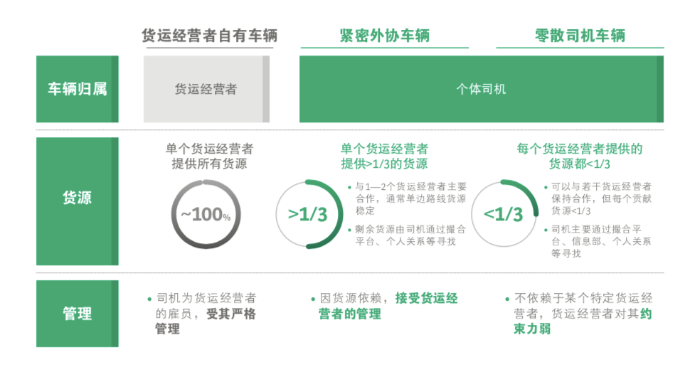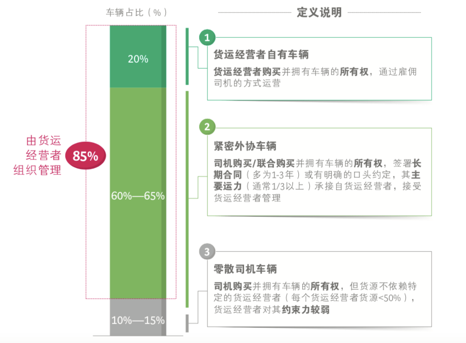 在 BCG的《中國(guó)公路貨運(yùn)市場(chǎng)發(fā)展趨勢(shì)》報(bào)告中, 只要一個(gè)車(chē)隊(duì)、物流公司掌握了一個(gè)社會(huì)化運(yùn)力超過(guò)1/3的穩(wěn)定貨源時(shí),就可以將這個(gè)運(yùn)力歸入貨運(yùn)經(jīng)營(yíng)者的管理規(guī)模之內(nèi)。