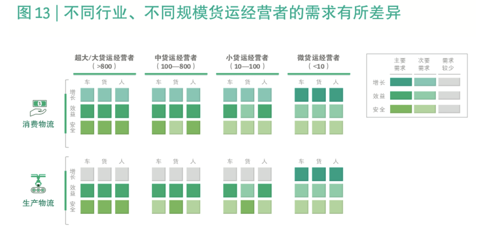 報(bào)告顯示,微貨運(yùn)經(jīng)營(yíng)者最關(guān)注增長(zhǎng),中小貨運(yùn)經(jīng)營(yíng)者注重效率提升,大貨運(yùn)經(jīng)營(yíng)者則更強(qiáng)調(diào)安全。消費(fèi)物流相對(duì)更注重車(chē)和人的管理,生產(chǎn)物流則更注重貨物的管理。