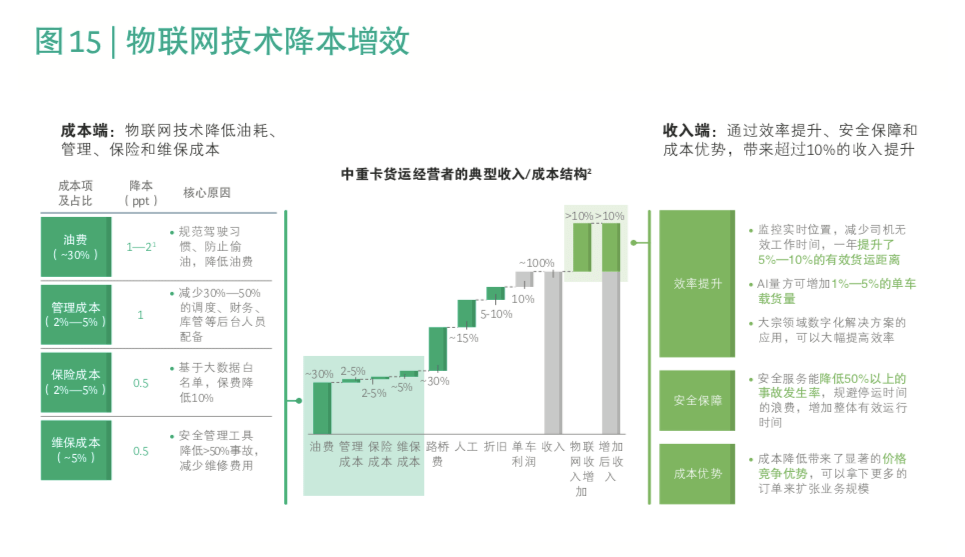 比如效益方面,可以利用甩掛、甩箱解決方案、AI量方、油耗檢測(cè)、IoT+保險(xiǎn)、車(chē)輛調(diào)度、在線(xiàn)結(jié)算、油卡、ETC等實(shí)現(xiàn)降本增效。