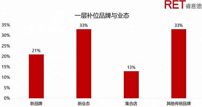 然而近年來誠如前文所言,以快時尚品牌為核心的次主力店軍團(tuán)也同樣面臨著新舊交替的周期性問題,在《快時尚下場,消費者選了誰來上場補(bǔ)位》一文中,RET睿意德曾分享最新的行業(yè)觀察,新品牌、新業(yè)態(tài)在替代快時尚品牌的過程中,已占到50%以上的比例,而采取其他傳統(tǒng)品牌作為面積消化手段的僅占33%。已充分說明了傳統(tǒng)品牌作為主力店品牌集群的做法正在不被業(yè)界所采納。同時我們也驚喜地發(fā)現(xiàn)了國潮品牌、個性化潮牌在購物中心里扮演的角色日益重要,并且在購物中心一層所占據(jù)的比例呈現(xiàn)出穩(wěn)中有升的氣象。