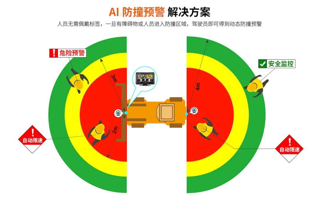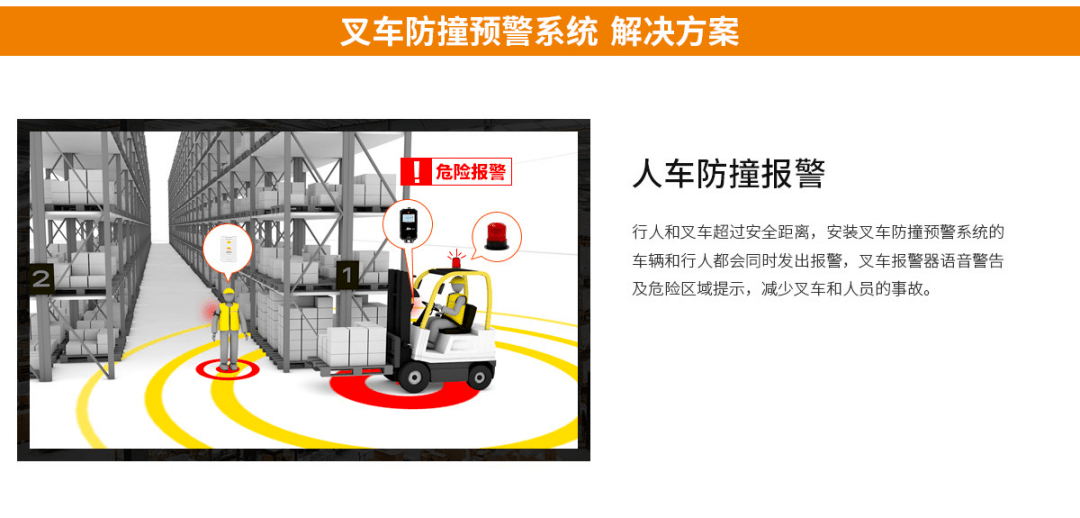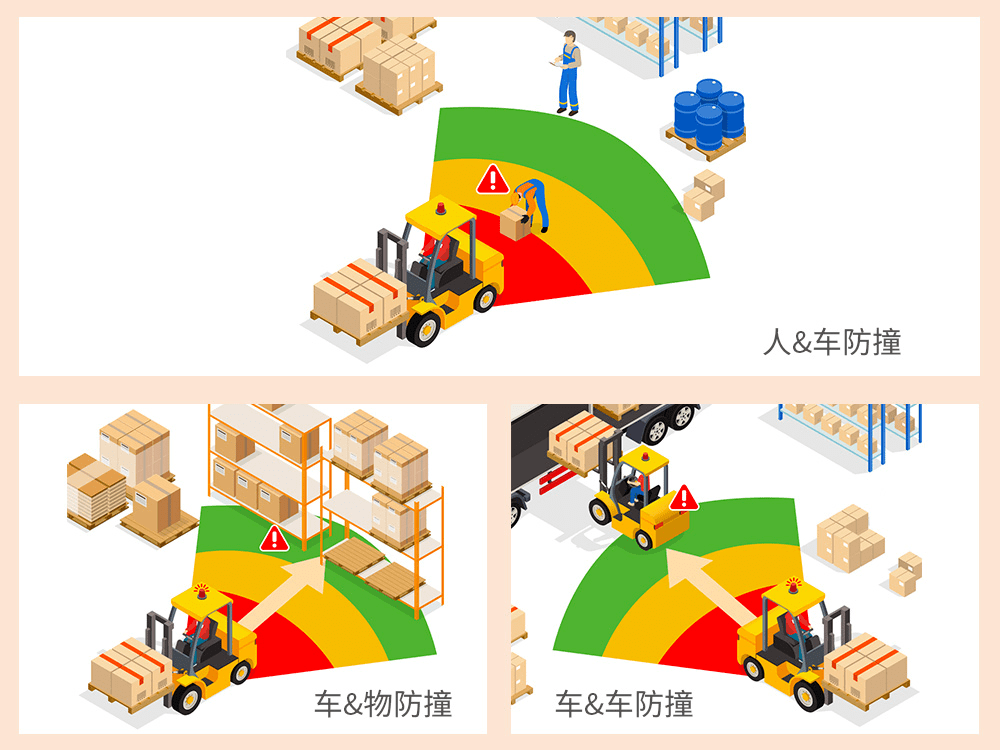 AI 叉車防撞預(yù)警系統(tǒng),駕駛員及倉庫人員無需佩戴身份識別工卡,一旦有障礙物或人員進入危險區(qū)域,駕駛員即可得到動態(tài)防撞預(yù)警,從而有效提升叉車搬運安全。