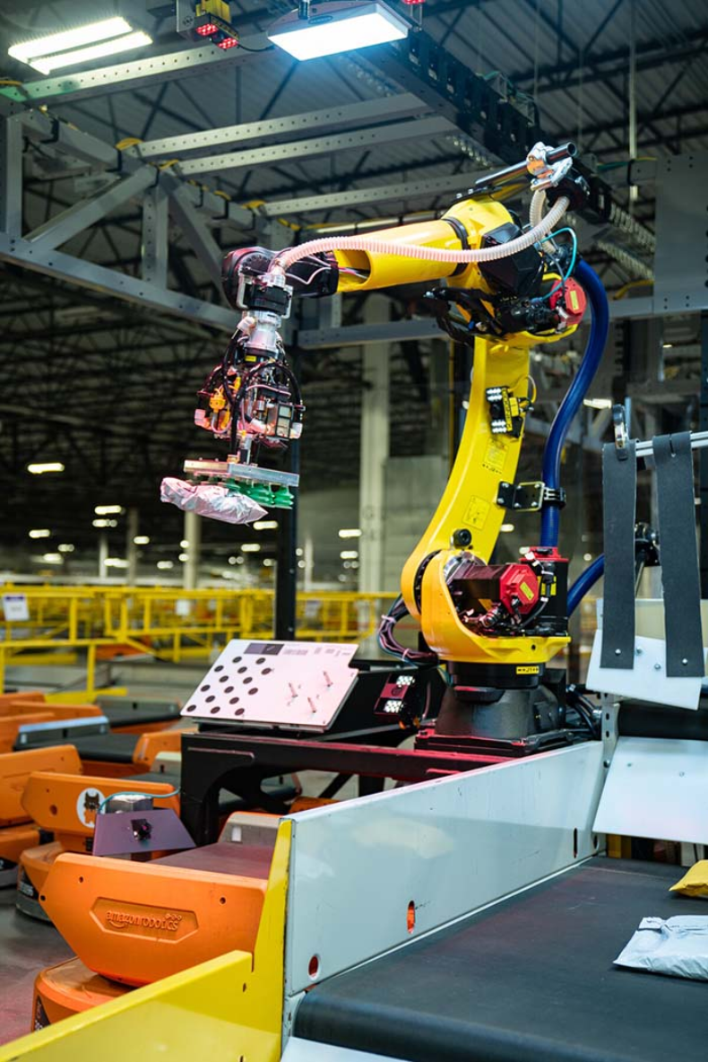 2021年,亞馬遜物流中心開始啟用 Robin。雖然外表仍是傳統(tǒng)工業(yè)機械臂,但視覺系統(tǒng)賦予 Robin 靈活應對變化世界的能力。