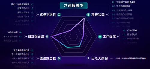 目前行業(yè)中對于高危司機的評定多半過于單一,基于G7易流安全管理平臺上數(shù)十萬司機的風(fēng)險表現(xiàn)分析,G7易流提出「六邊形模型」,針對司機的工作強度、精神狀態(tài)、駕駛平穩(wěn)性、管理配合度、道路安全性、出險大數(shù)據(jù)6個維度進(jìn)行評分,生成司機成績單,幫助車隊判斷和識別司機好壞,避免經(jīng)驗誤判。
