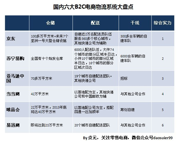 最后,我們以一張表格概況上面談到的內(nèi)容,各家電商的物流實(shí)力就會一目了然了。