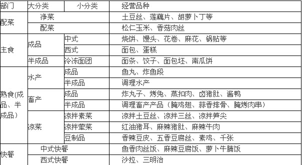 ?。?)產(chǎn)品定位:表1基本列出了一般大型超市食品加工的產(chǎn)品分類,各超市可根據(jù)自己的優(yōu)勢來選擇。