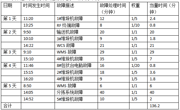 在上面的計算中,AS/RS堆垛機(jī)有5個并聯(lián)子系統(tǒng),RF終端有10個并聯(lián)子系統(tǒng),包裝臺有10個并聯(lián)子系統(tǒng),所以,它們的當(dāng)量時間需要按照并聯(lián)系數(shù)折算。這是符合實(shí)際情況的。