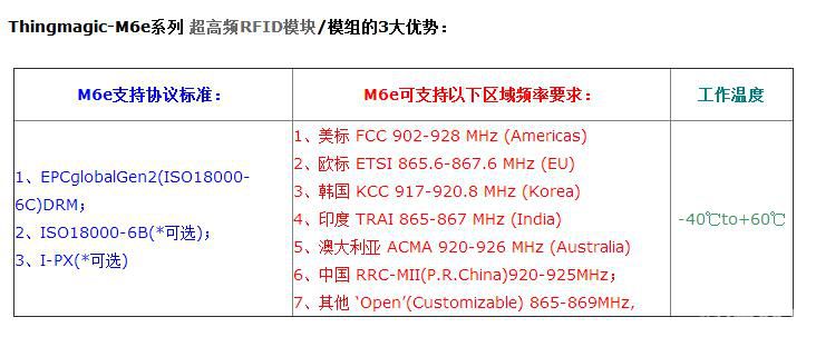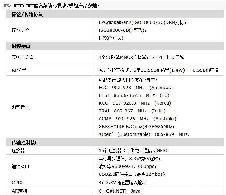 Thingmagic Mercury6e(M6e)嵌入式超高頻RFID讀寫器模塊,是專門為企業(yè),商業(yè)和工業(yè)環(huán)境設(shè)計(jì),滿足在曠闊的范圍內(nèi)的高性能的讀寫需求。M6e提供世界領(lǐng)先的性能,是全球體積最小的4通道讀寫模組,并縮短讀寫器由開發(fā)到推向市場(chǎng)的OEM時(shí)間,增加經(jīng)銷商和解決方案供應(yīng)商提供給最終客戶的價(jià)值。M6e模塊按照全尺寸讀寫器的性能標(biāo)準(zhǔn)設(shè)計(jì),但尺寸更加小巧,可以在移動(dòng)設(shè)備中使用。M6e支持4個(gè)天線端口,最大輸出功率為31.5dBm,無需使用功分器,為每個(gè)端口提供低成本的設(shè)計(jì),優(yōu)異的SDR(Software Designed Radio)架構(gòu)支持:遠(yuǎn)程升級(jí),新標(biāo)簽&RFID標(biāo)準(zhǔn),安全性改善,和其他RFID系統(tǒng)發(fā)生的改善。