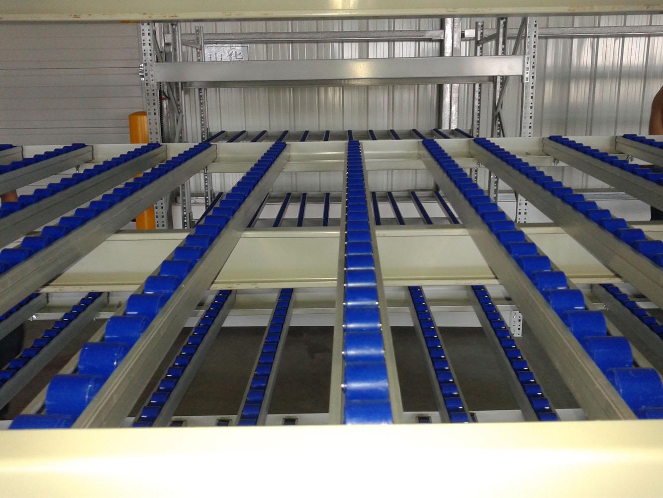 通過滾道將貨物從配貨端輸送到取貨端,貨物借助重力自動下滑,可實現(xiàn)先進(jìn)先出作業(yè),使用成本低存儲速度快、密度大。