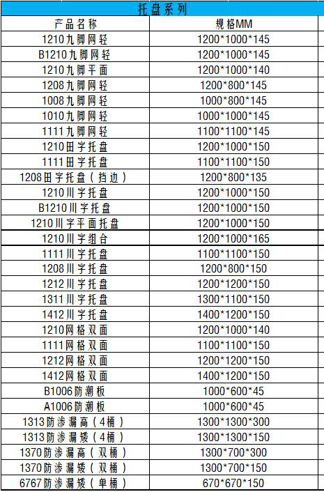 廠(chǎng)家塑料托盤(pán)規(guī)格表如下:
