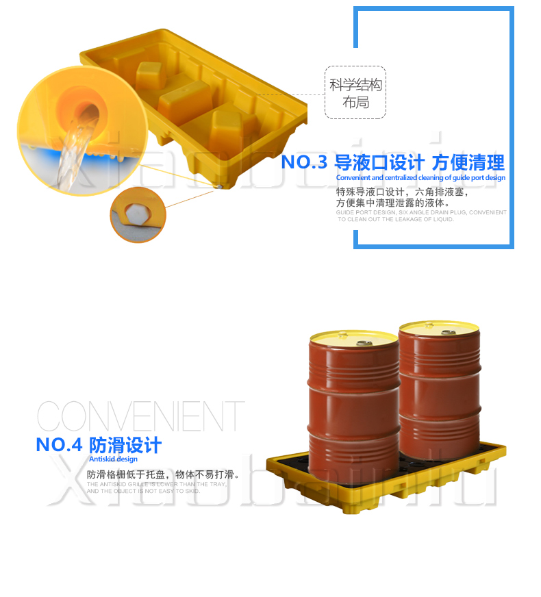 3、防泄漏托盤的設(shè)計符合油桶和化學(xué)品桶安全存放、搬運和處理要求,細(xì)微處的設(shè)計做的巧妙!比如:油桶若要直放,油桶應(yīng)該輕微傾斜,使水份不會積聚在桶蓋周圍。無論桶蓋有多好的密封性,在氣溫的變化下,桶內(nèi)產(chǎn)品之膨脹及收縮會產(chǎn)生真空,而把留存在桶面 的水份從蓋上吸入桶內(nèi)。