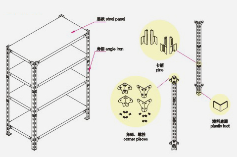 角鋼貨架由立柱、層板。角碼、卡銷、專用螺栓和塑料底腳組成。