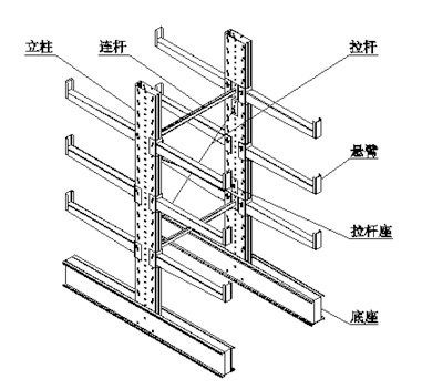 懸臂式貨架一般由底座、立柱、懸臂、連桿、拉桿座、拉桿組成。懸臂可以是單面或雙面,懸臂式貨架具有結構穩(wěn)定,載重能力好、空間利用率高等特點。根據承載能力可分為輕量型、中量型、重量型三種。