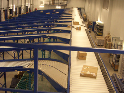 自動(dòng)分揀系統(tǒng)一般由識(shí)別裝置、控制裝置、分類裝置、 輸送裝置和分揀道口組成。識(shí)別裝置通過條形碼掃描、色碼掃描、重量檢測、語音識(shí)別、高度檢測及形狀識(shí)別等方式,利用LAN、總線技術(shù)或RF技術(shù)將分揀要求傳給分揀控制裝置。 控制裝置的作用是識(shí)別、接收和處理分揀信號(hào),根據(jù)信號(hào)指示分類裝置和輸送裝置進(jìn)行相應(yīng)的作業(yè)。分類裝置接受控制,當(dāng)具有同類分揀信號(hào)的商品經(jīng)過該裝置時(shí),能夠改變其運(yùn)行方向使其進(jìn)入其他輸送機(jī)或分揀道口輸送裝置起輸送作用。分揀道口一般由鋼帶、皮帶、滾筒等組成滑道,使貨物脫離主輸送機(jī)滑向集貨區(qū)域的通道,最后入庫或組配裝車進(jìn)行配送。