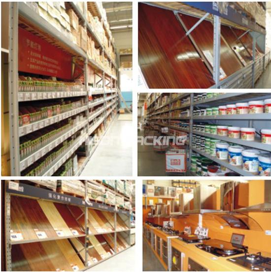 建材超市是當(dāng)今人們購買高品質(zhì)裝飾材料的場所,是一種剛剛興起的專業(yè)商店。建材超市中通常采用橫梁式貨架配置金屬網(wǎng)孔板,掛鉤組合,同時(shí)需要精良的木工裝修來共同展示店堂內(nèi)的產(chǎn)品。