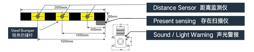 車輛/人員檢測系統(tǒng) · 防撞桿中安裝了監(jiān)測器探測貨車接近距離是否已經(jīng)在4米之內 · 同時安裝了人員監(jiān)測系統(tǒng)在平臺旁邊 2米 x 2米的預警區(qū)域內 | |