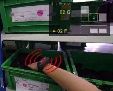 通過集成RFID技術,xBand可通過藍牙與主機設備進行通信,識別位置,當工作人員移動他的手臂來揀選貨物時,xBand會自動掃描RFID標簽,并向主機設備自動發(fā)送確認,減少了作業(yè)流程,且讀取更精準。此外,xBand能確認揀選動作的聲音和放置動作是否正確,并針對不正確的揀選動作進行震動反饋。
