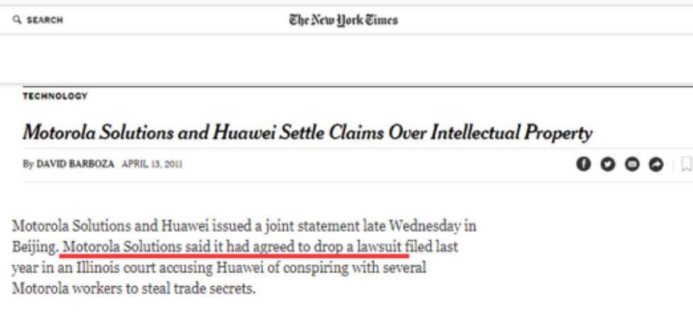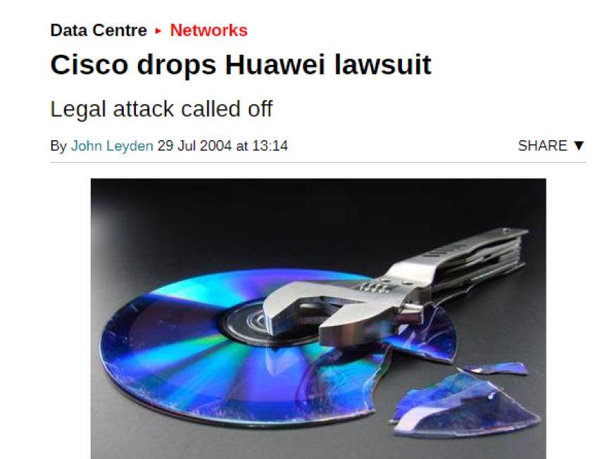 而且,《華爾街日?qǐng)?bào)》提到的那些10多年前的舊案,也是以起訴華為的美國(guó)公司自己撤訴而告終的。比如《華爾街日?qǐng)?bào)》用大篇幅提到的2003年華為和美國(guó)思科的源代碼“抄襲”糾紛,以及10年前摩托羅拉起訴華為“侵犯知識(shí)產(chǎn)權(quán)”的案子,最后就是思科和摩托羅拉分別在2004年和2011年自行撤訴。