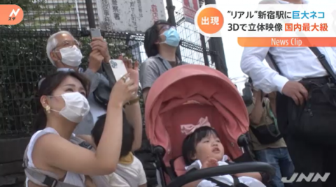 富士電視臺報道截圖巨大的3D貓咪引發(fā)日本國內(nèi)外巨大的反響,新宿街頭的游客日前增加了不少,都停在附近看貓。