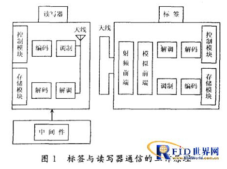 RFID是一項利用射頻信號通過空間耦合(交變磁場或電磁場)實現(xiàn)無接觸信息傳遞并通過所傳遞的信息達到識別目的的技術。他的核心部件是一個電子標簽,通過相距幾厘米到幾米甚至十幾米的距離內(nèi)讀寫器發(fā)射的無線電波,讀取電子標簽內(nèi)的儲存信息。無源RFID標簽是將讀寫器發(fā)送的射頻能量轉(zhuǎn)化為直流電源為芯片電路供電的。圖1為標簽與讀寫器通信的工作原理示意圖。