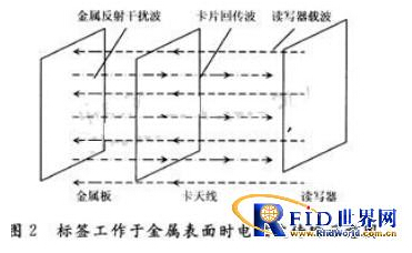 普通RFID標簽直接貼附于金屬表面上,由于金屬表面對入射電磁波的反射作用,將會有較強的反方向電磁波也穿過電子標簽。入射波與反射波相位疊加后將會抵消一部分,強度也會大大削弱,嚴重影響讀寫器對RFID標簽的讀取距離,甚至無法讀取和RFID標簽上的數(shù)據(jù),同時,讀寫器與RFID標簽間產(chǎn)生的磁通量會在金屬表面感應渦流,根據(jù)楞次定律,渦流對讀寫器的磁場起反作用,致使金屬表面上的磁場被強烈地衰減了。